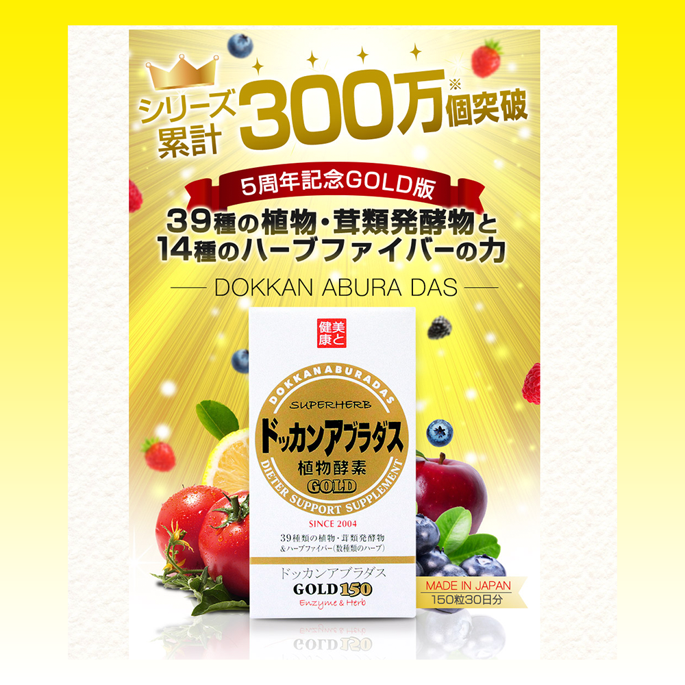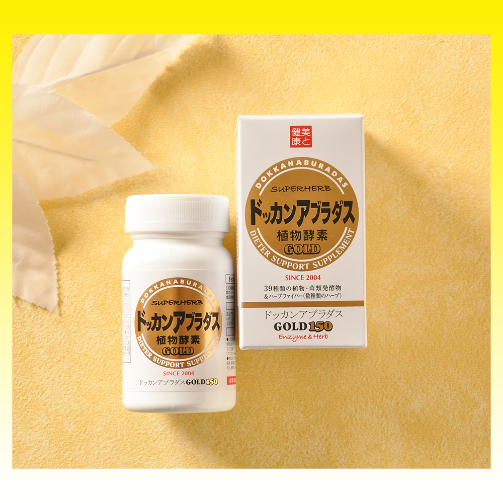 Dokkan Aburadas GOLD150 is a highly acclaimed supplement in Japan, with over 3 million units sold. This improved formula contains 10% more herbs, including added onion peel and selenium yeast, enhancing its effectiveness. It features a balanced blend of 39 fermented plants, mushrooms, herbal fibers, and other ingredients designed to support digestive health. Recommended for those experiencing persistent constipation or overeating, it is best taken before bedtime for noticeable results by morning. Each package contains 150 tablets, made authentically in Japan.
